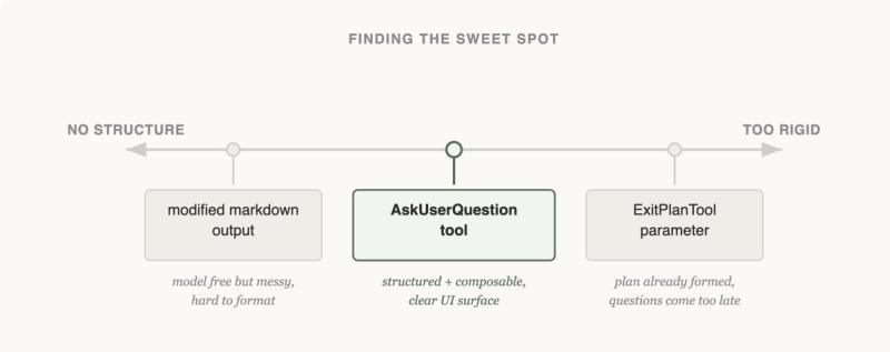 最初尝试在 ExitPlanTool 中添加一个问题数组参数,和计划一起返回。实现简单,但让 Claude 混淆了——既要给出计划,又要提出问题。如果用户的回答和计划冲突怎么办?是否需要调用两次 ExitPlanTool?我们意识到这种方法不可行,回到起点。(关于 ExitPlanTool 的更多内容见我们的提示缓存文章)