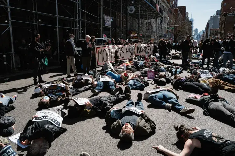 抵达Palantir办公室后,抗议者们在街道上倒地,进行“假死”抗议——这是一种常用于紧急人权斗争中的抗议形式。
